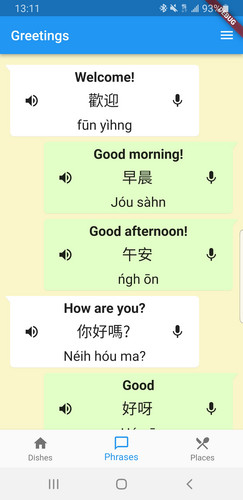 The speech plays at half speed to help you learn. The practice screen (tap the microphone) lets you adjust the playback speed, switch between Cantonese, Mandarin with traditional characters, and Mandarin with simplified characters (Cantonese is the default), and practice saying the words.